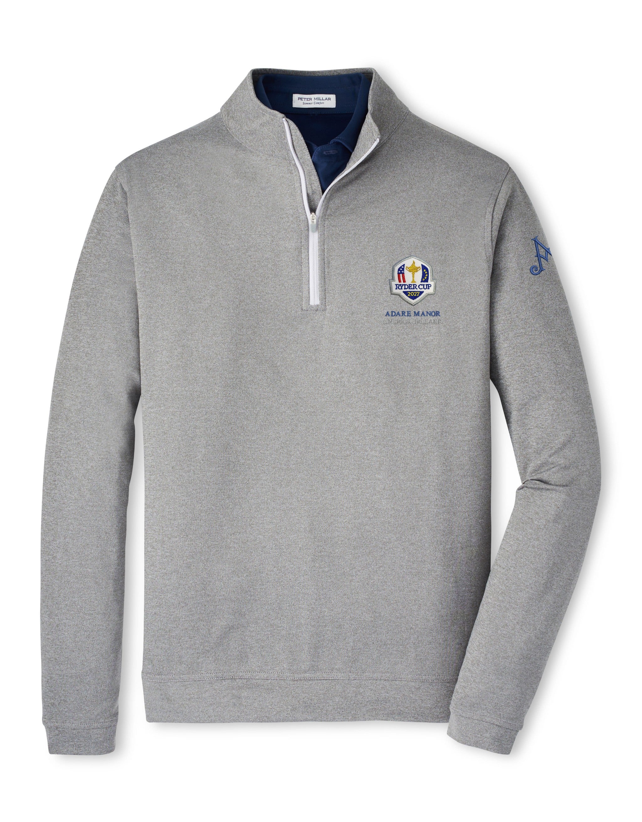 This Peter Millar iconic Perth quarter-zip delivers a performance-focused twist on a classic style. It offers four-way stretch, wicking and easy-care to keep you comfortable far beyond the final green. This style incorporates mélange yarns for a subtle look. Featuring the Adare Manor Ryder Cup 2027 logo on the left chest and Adare Manor logo on the sleeve.
