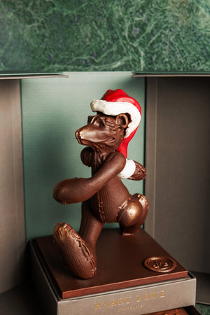 Celebrate the magic of the season with the Harry Lowes handcrafted Christmas chocolate bear, a limited-edition masterpiece that blends fine artistry with exceptional flavor. Individually crafted by expert chocolatiers, this enchanting milk and dark chocolate character sits on a chocolate base, wearing a festive Santa hat and finished with elegant bronze-toned accents. Presented in a bespoke presentation case with a hidden chocolate compartment, this piece is as delightful to open as it is to taste.