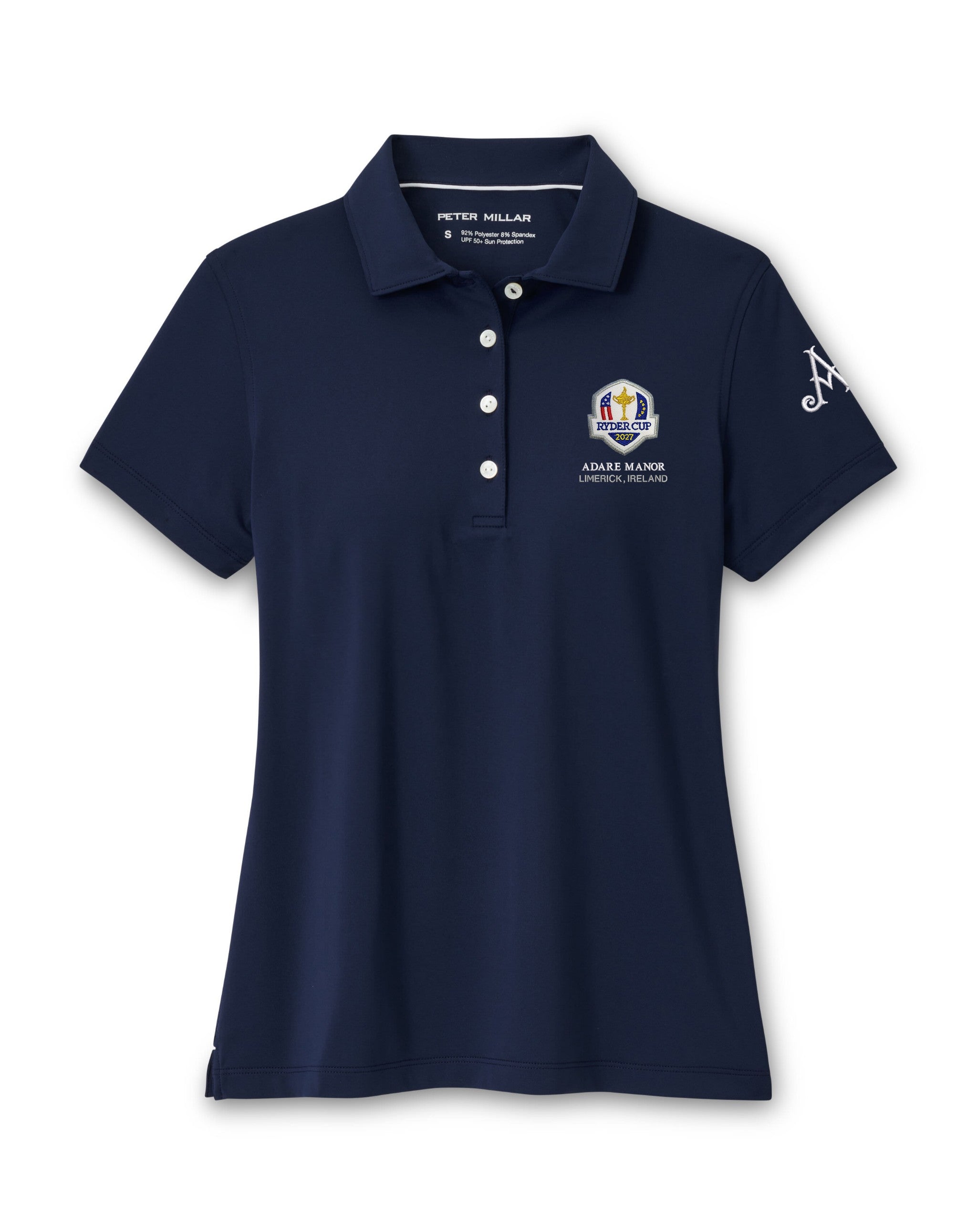 Featuring the Adare Manor Ryder Cup 2027 logo on the left chest and Adare Manor logo on the sleeve, this polo is designed to deliver superior comfort on and off the course. Made from signature performance fabric for a fluid drape and incredible softness. The four-way stretch fabric features wicking, UPF 50+ sun protection, odour-resistance and easy-care to keep you cool and comfortable. Finished with a self-fabric collar, four-button placket and notched hem.