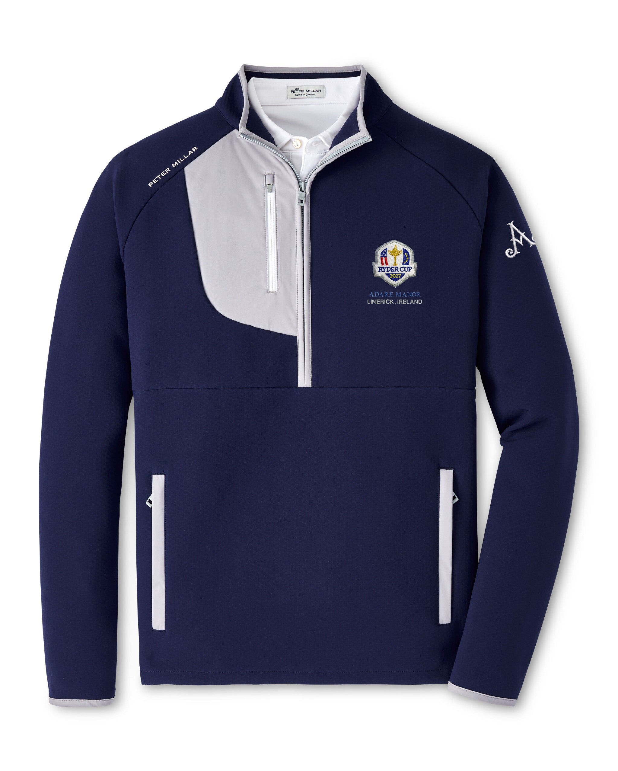 The Peter Millar Galeforce is an all-new midweight performance design ready to take on the elements. An innovative 3-D weaving process forms its single layer, durable softshell fabric that is highly wind and water resistant. A gridded interior helps both retain warmth and promote breathability. Finished with two handwarmer pockets, a chest pocket and a two-way zip closure Featuring the Adare Manor Ryder Cup 2027 logo on the left chest and Adare Manor logo on the left sleeve.